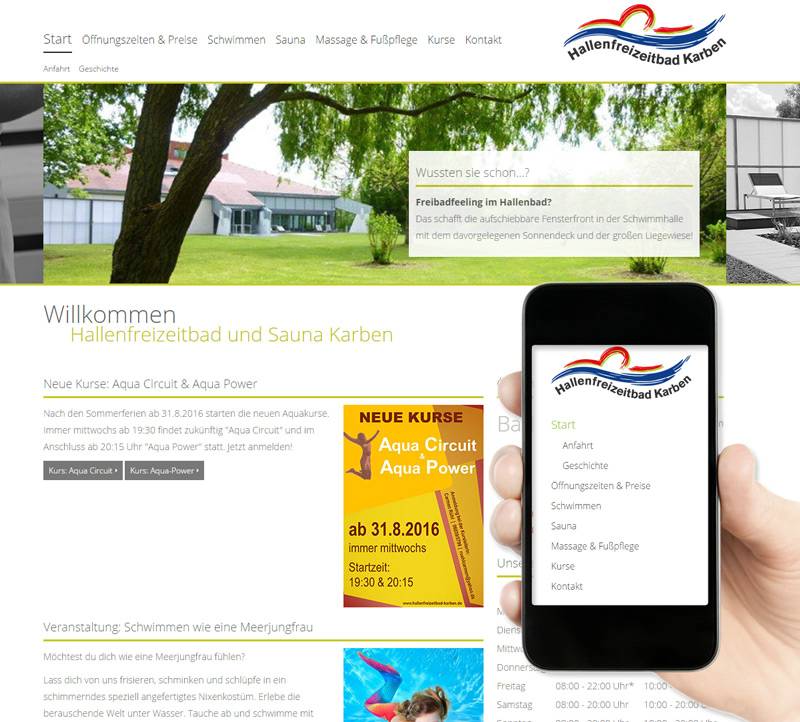Der Auftritt ist SEO-Optimiert, SSL-Verschlüsselt, W3C-Validiert und natürlich responsive, damit auch Smartphone-Benutzer sich über die Aktionen und Öffnungszeiten des Bades und der Sauna informieren können.